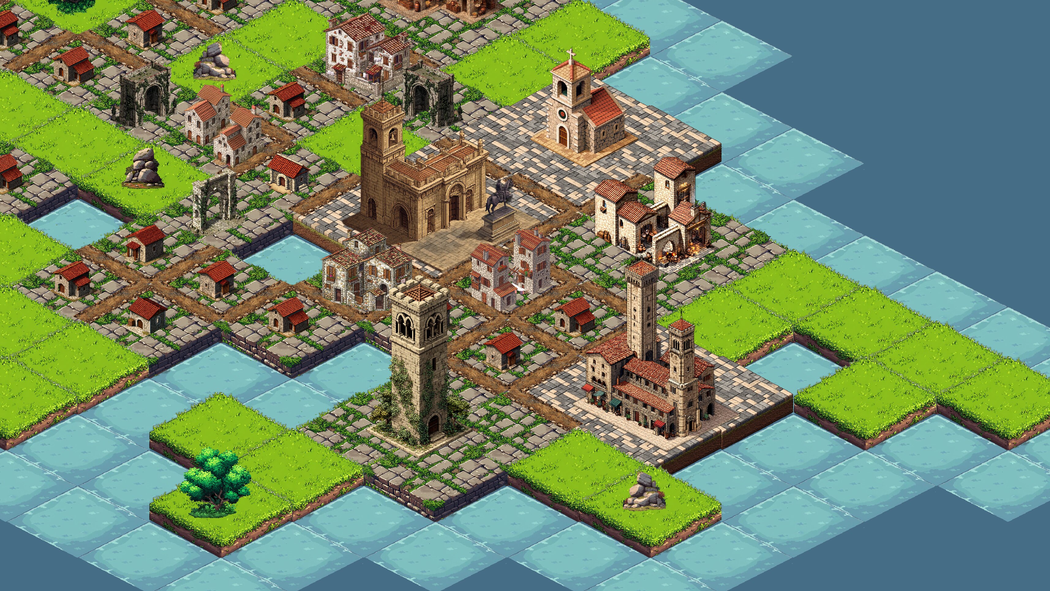 - Isometric pixel art with a warm medieval Italian aesthetic